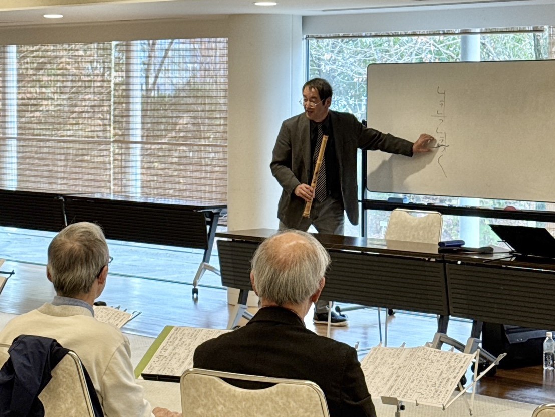 フォルテ、ピアノの順番を交互に入れ替えて「ああ、さっきのより今の演奏の方が良いですね。」などと、楽譜にとらわれずに感覚で音楽を感じでいらっしゃるのがよくわかるご指導で、講習は進みます。尺八のソロも順番に担当をまわされて、皆さん綺麗な音色を次々にお聴かせくださいました。